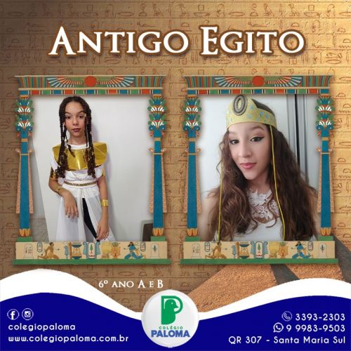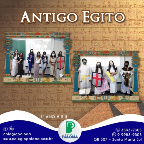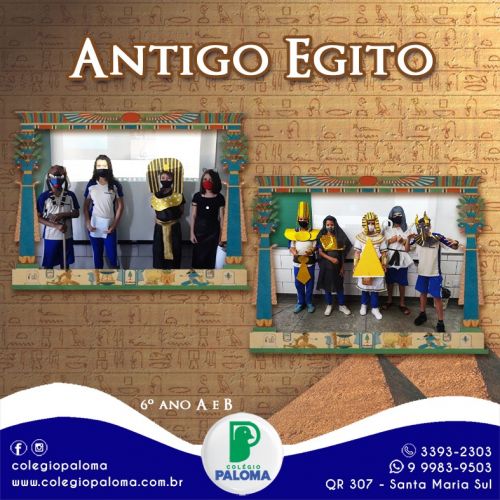 Os alunos do 6º ano A e B apresentaram um seminário na aula de história, sobre o Antigo Egito. Após pesquisa, os alunos confeccionaram suas fantasias e organizaram suas apresentações. Os subtemas foram Sociedade, Religião, Reis e Rainhas e Arquitetura Egípcia. Alguns alunos usaram como recurso cartazes, slides e até mesmo maquetes e acessórios reproduzidos fazendo referência aos da época.