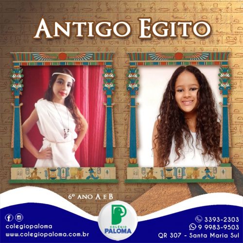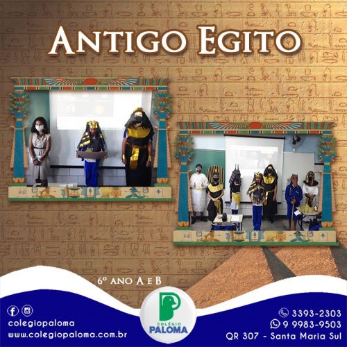 Os alunos do 6º ano A e B apresentaram um seminário na aula de história, sobre o Antigo Egito. Após pesquisa, os alunos confeccionaram suas fantasias e organizaram suas apresentações. Os subtemas foram Sociedade, Religião, Reis e Rainhas e Arquitetura Egípcia. Alguns alunos usaram como recurso cartazes, slides e até mesmo maquetes e acessórios reproduzidos fazendo referência aos da época.