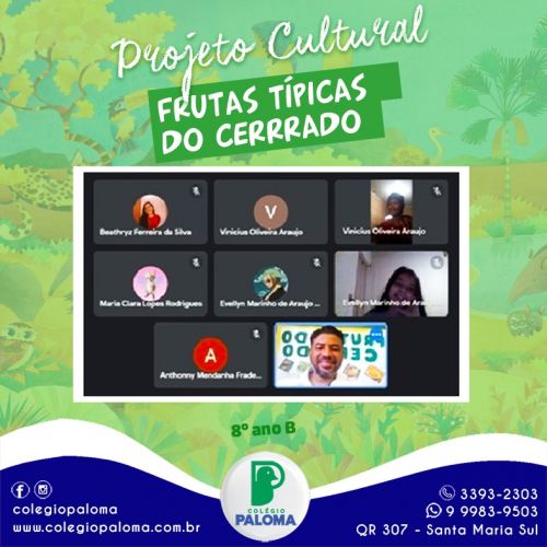 O Cerrado é considerado o segundo maior bioma do Brasil, possuindo uma grande diversidade de fauna e flora. Com o intuito de conhecer um pouco mais desse bioma a turma do 8º ano B escolheu falar sobre as frutas que encontramos nessa região, pesquisaram sobre a origem das frutas, nome científico, os benefícios e a economia das regiões que são produtoras. Finalizando o projeto, prepararam e apresentaram duas receitas (doce de pequi e suco de jenipapo), o que demonstra o quão é significativo trabalhar com as metodologias ativas no processo ensino-aprendizagem.