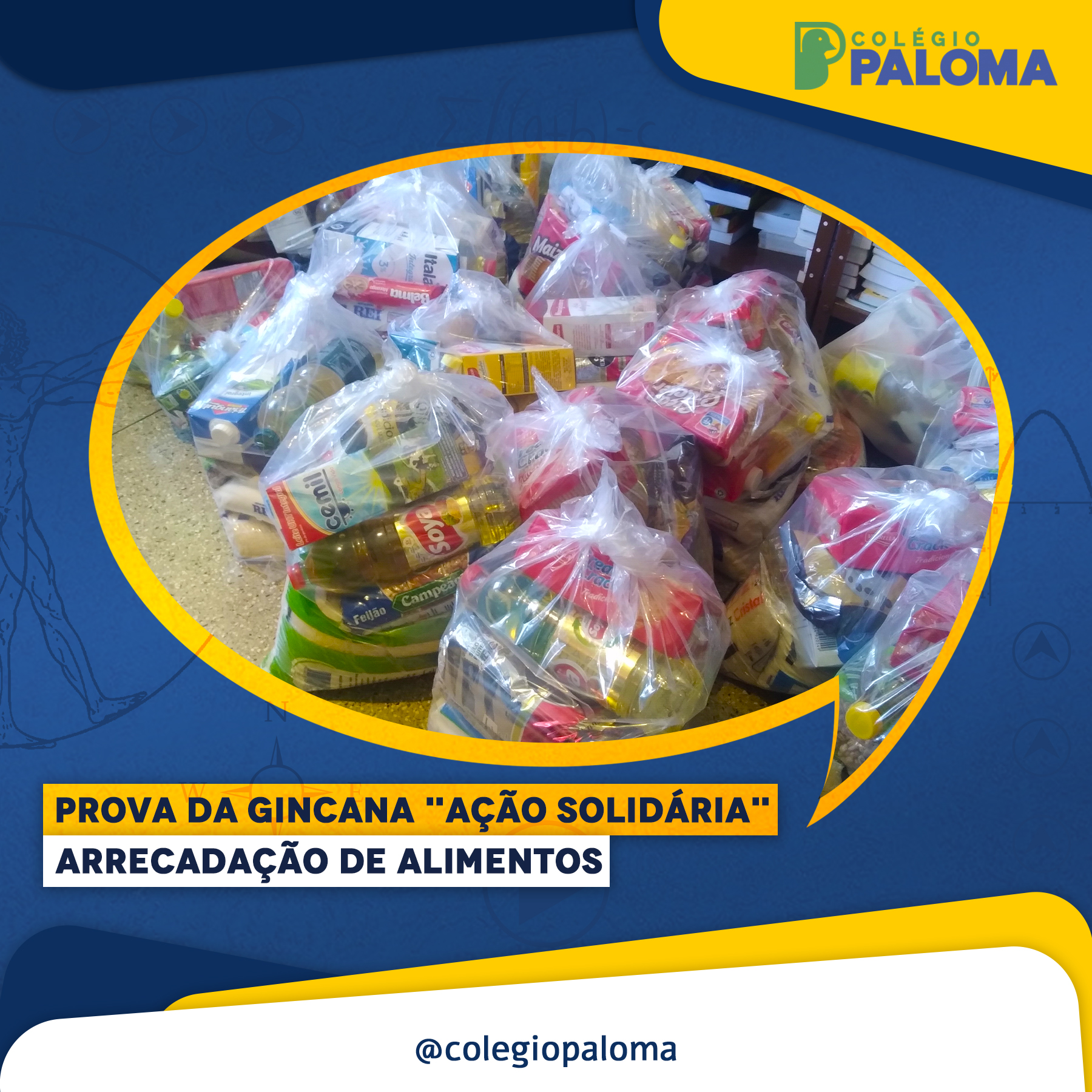 Uma das provas realizadas durante o período da gincana foi a ação solidária onde os alunos arrecadaram alimentos e montaram cestas básicas para entregarem as famílias carentes de nossa comunidade.