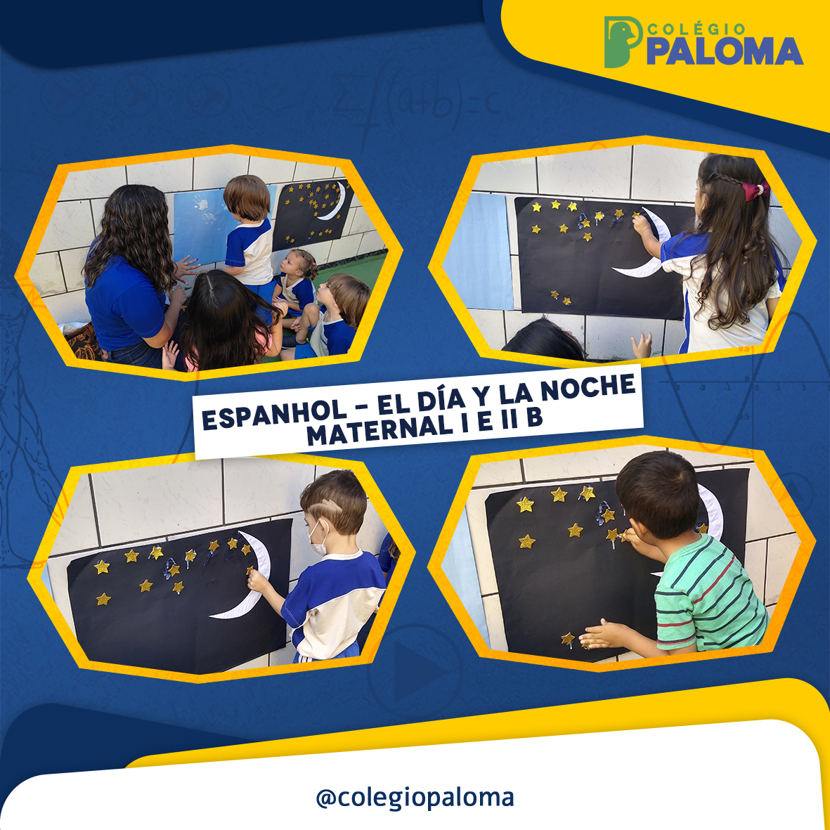 Foi cantando, criando e brincando que os alunos do Maternal I e II B da Educação Infantil desenvolveram as habilidades de reconhecimento do espaço temporal e a percepção dos elementos presentes do dia e da noite na língua espanhola.